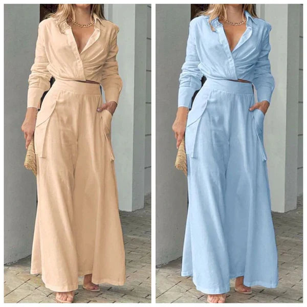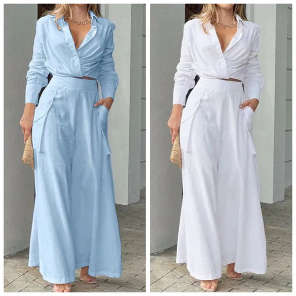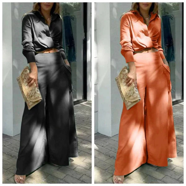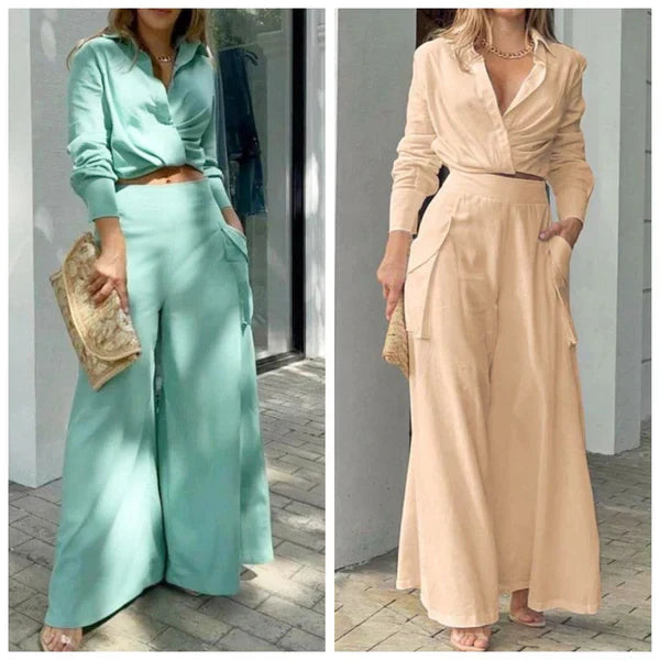 Zdefiniuj na nowo swój styl dzięki naszemu stylowemu dwuczęściowemu zestawowi: bluzce z długim rękawem i spodniom z wysokim stanem. Bez wysiłku łączy w sobie wyrafinowanie i klasę z bluzką z mankietami i spodniami z wysokim stanem w jednolitym kolorze. Idealny na każdą okazję, formalną lub swobodną, gwarantuje wyrafinowany i elegancki wygląd oraz oferuje wszechstronną modę bez wysiłku.