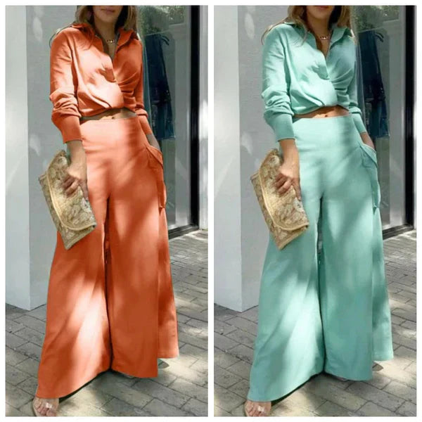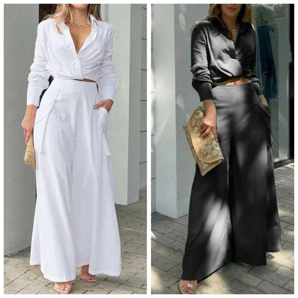 1 * Elegancki dwuczęściowy zestaw: Top z długim rękawem i spodnie z wysokim stanem