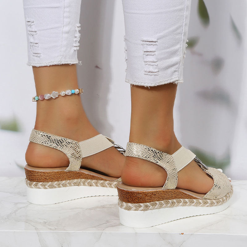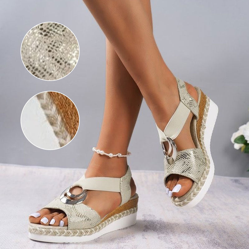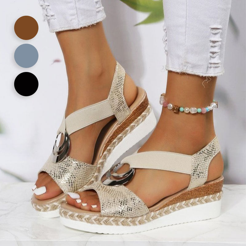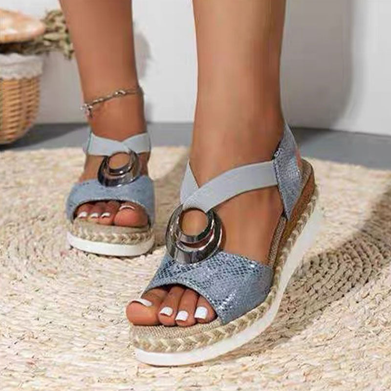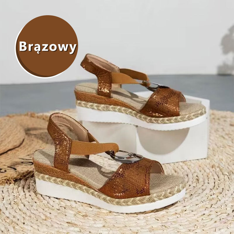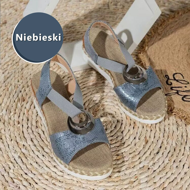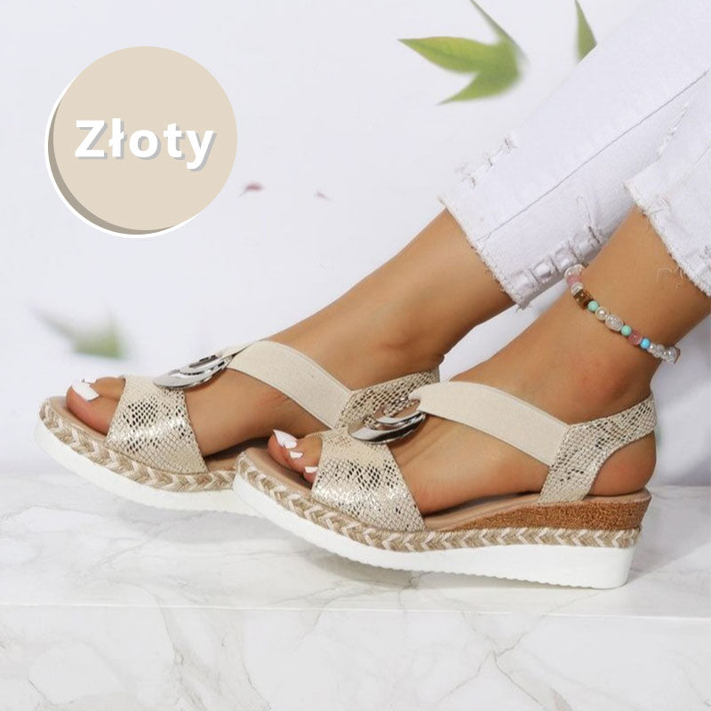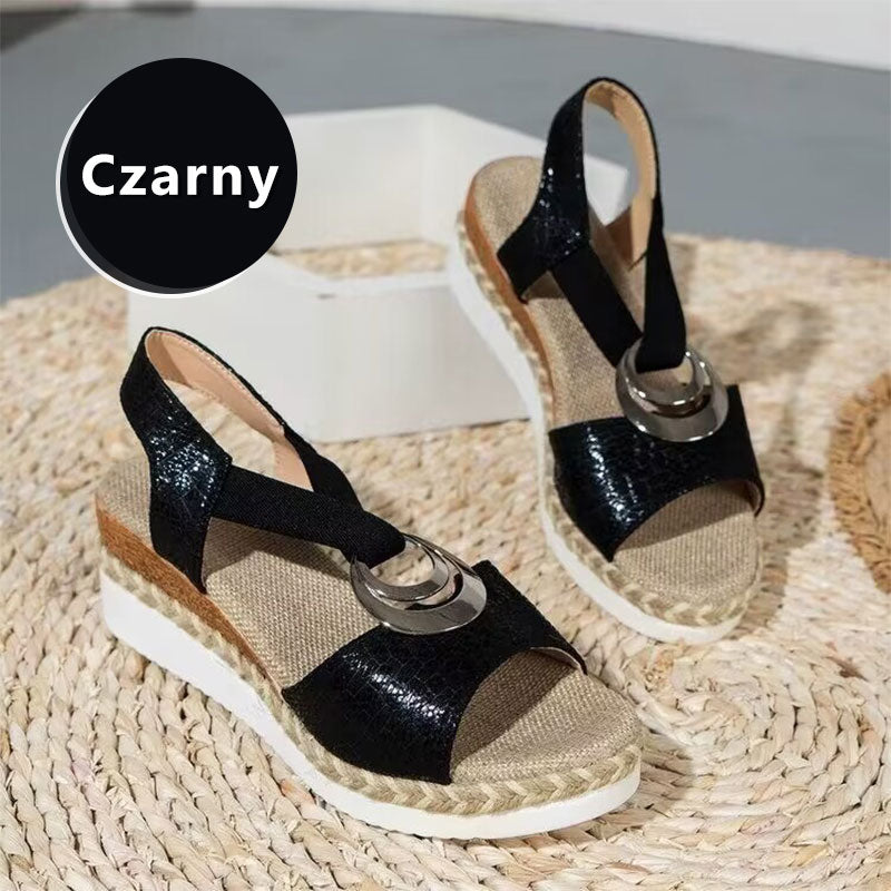 STYLIZOWANY DESIGN - Podnieś swój letni look dzięki naszym eleganckim sandałom na koturnie z modnym otwartym noskiem i metalowymi ozdobami, dodając odrobinę blasku każdej stylizacji.