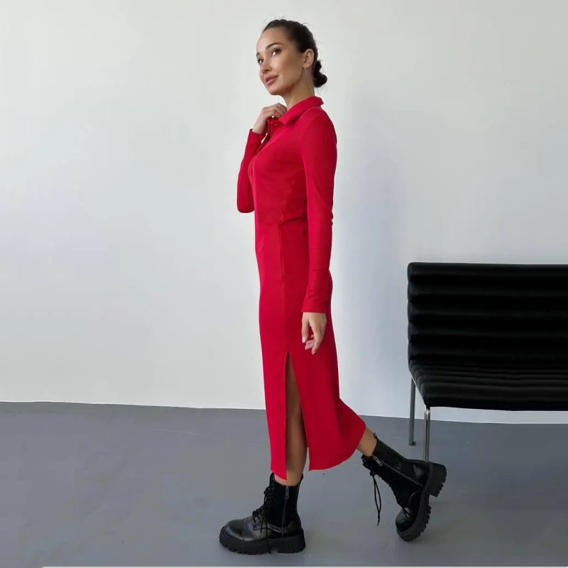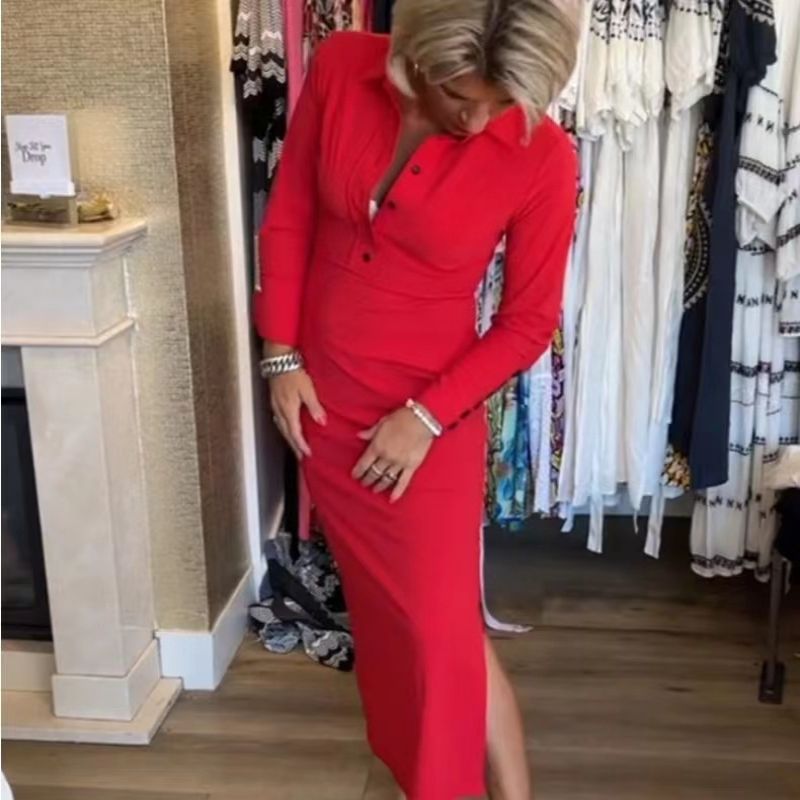 Seksowna czerwona sukienka damska z długim rękawem i klapami