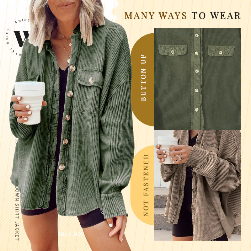 Button-down shirt jackets are the perfect complement to a variety of tops and bottoms such as skirts, suspenders, leggings, and even sportswear, shirts for spring, autumn, or warm climates in winter.